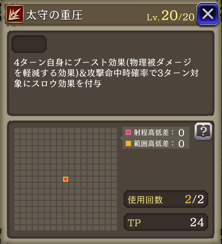 ![]() 太守のコート | 545 | 4ターン自身にブースト(物理被ダメージ軽減+30%)・攻撃命中時、確率でスロウ付与(係数0.25) | 24 | ![]() 太守の重圧 | 服 | 太守のコート | 服 | スノウ(LRFFXIII) | |