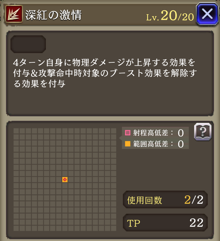 ![]() 黄昏の衣 | 468 | 3ターン自身を中心とした十字範囲内の対象へ斬撃耐性+25、攻撃命中時3ターン対象に斬撃耐性貫通-30する効果を付与 | 24 | ![]() 黄昏の斬護 | 服 | 黄昏の衣 | 防具 | 転晶弓シャドウリンクス | |