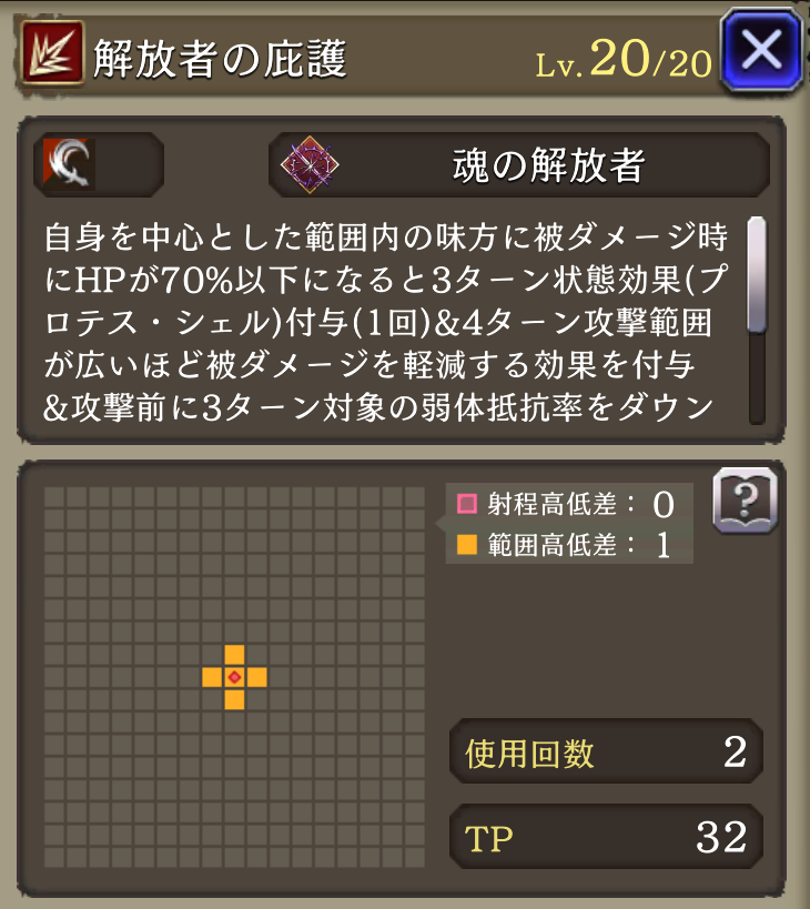 ![]()  | 剣騎士の加護 4T範囲内の味方の クリティカル回避+20 斬撃耐性+25 4T自身の 防御+20、精神+20 与ダメHP50%吸収  | 1441  |