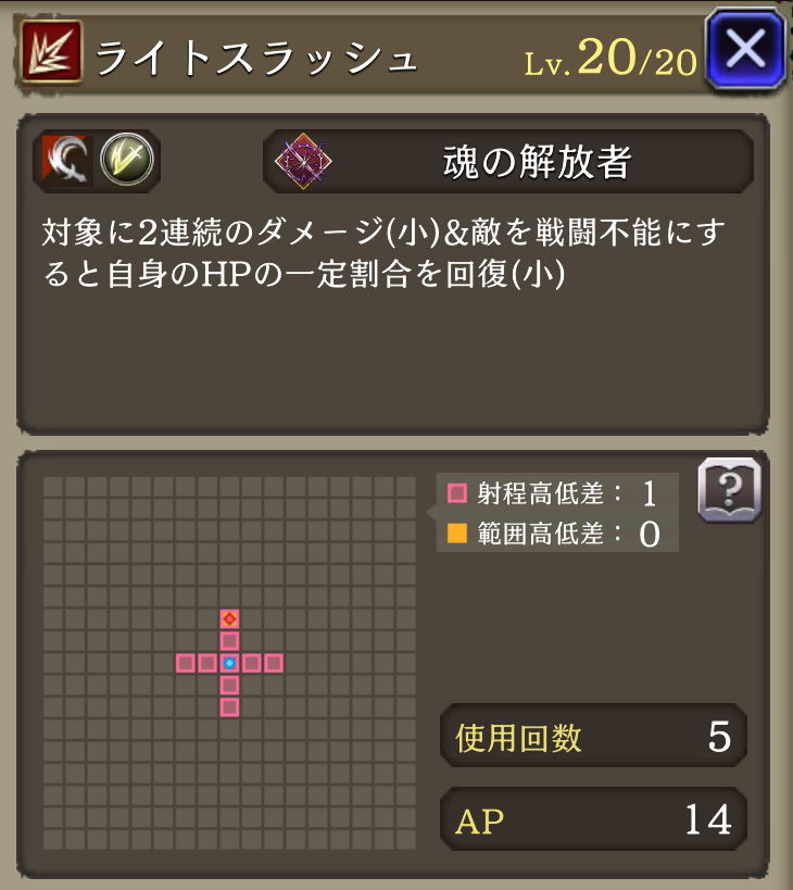 ソードナイトの心得  | 斬撃攻撃耐性+12、距離3~6マス遠くなる程魔法被ダメージ軽減(最大)  |