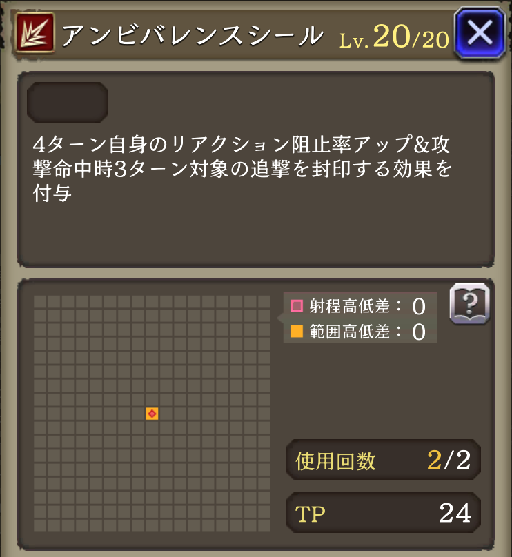 ![]() 4T自身のリアクション阻止率アップ、攻撃命中時3T追撃封印  | 543  |