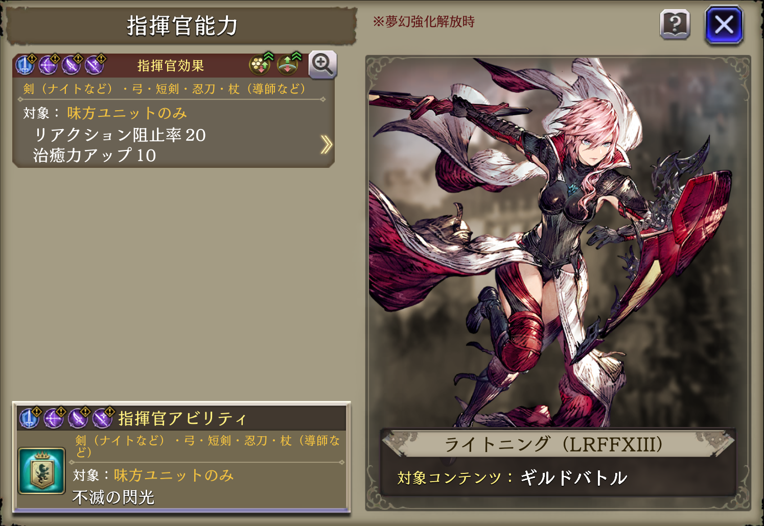 | ・味方の光属性ユニットのHP上限+10%・光属性アビリティ攻撃+15 ・自身の物理ダメージ軽減貫通+20・治癒力+15  |