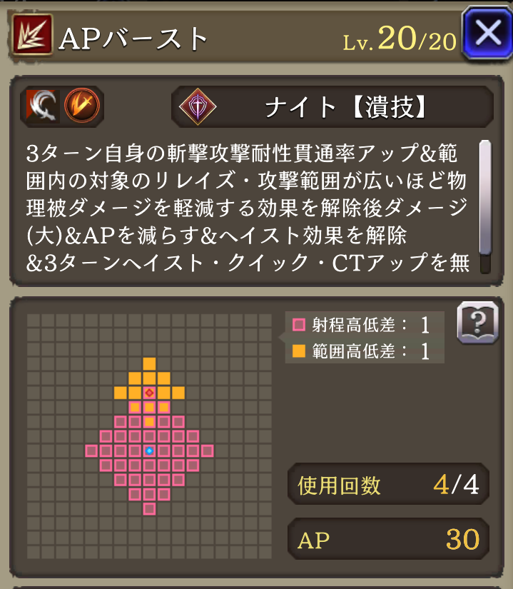 「APバースト」 使用回数+2、範囲:十字→菱形に リレイズ・攻撃範囲が広い程被ダメ軽減解除後ダメージ&ヘイスト解除 3Tヘイスト・クイック・CTアップ無効 |