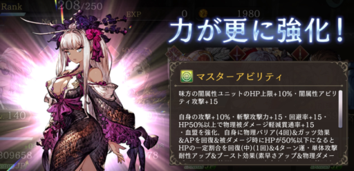 ![]() 味方の闇属性ユニットのHP上限+10%・闇属性アビリティ攻撃+15 自身の攻撃+10%、斬撃攻撃力+15、回避率+15 ⇩MA強化⇩ 味方の闇属性ユニットのHP上限+10%・闇属性アビリティ攻撃+15 自身の攻撃+10%、斬撃攻撃力+15、回避率+15、HP50%以上で物理被ダメ軽減貫通+15% | ||