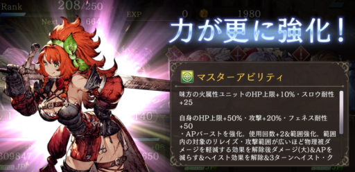 ![]() 味方の火属性ユニットのHP上限+10%・スロウ耐性+25 自身のHP上限+50%、攻撃+20%、フェネス耐性+50 ⇩MA強化⇩ 変化なし | ||
