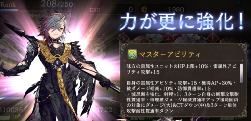 ![]() 味方の雷属性ユニットのHP上限+10%・雷属性アビリティ攻撃+15 自身の雷属性アビリティ攻撃+15、AP獲得補正+30%、物魔被ダメ軽減10% ⇩MA強化⇩ 味方の雷属性ユニットのHP上限+10%・雷属性アビリティ攻撃+15 自身の雷属性アビリティ攻撃+15、AP獲得補正+30%、物魔被ダメ軽減10%、防御貫通+15 | ||