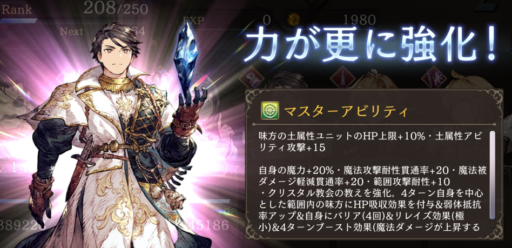 ![]() 味方の土属性ユニットのHP上限+10%・土属性アビリティ攻撃+15 自身の魔法耐性貫通率+20・範囲攻撃耐性+10 ⇩MA強化⇩ 味方の土属性ユニットのHP上限+10%・土属性アビリティ攻撃+15 自身の魔力+20%・魔法耐性貫通率+20・魔法被ダメ軽減貫通+20%・範囲攻撃耐性+10 | ||