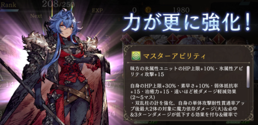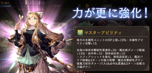 ![]() 味方の水属性ユニットのHP上限+10%・水属性アビリティ攻撃+15 自身の魔法被ダメージ軽減+10・命中率+10・弱体抵抗率+10 ⇩MA強化⇩ 味方の水属性ユニットのHP上限+10%・水属性アビリティ攻撃+15 自身の単体貫通+30・魔法被ダメージ軽減+15・命中率+10・弱体抵抗率+10 | ||