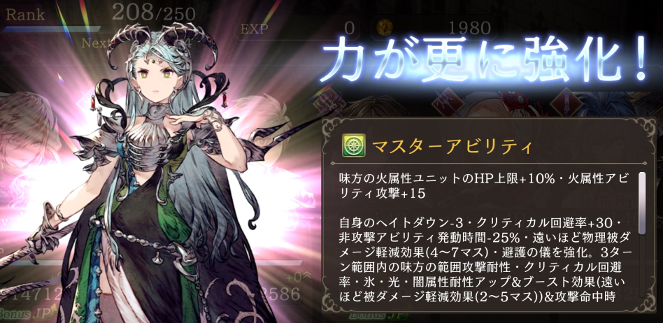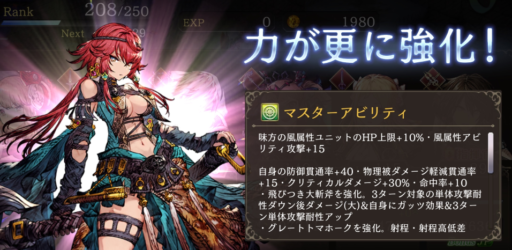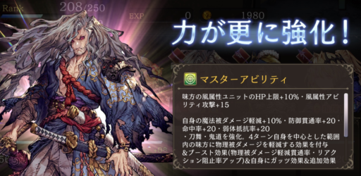 ![]() 味方の風属性ユニットのHP上限+10%・風属性アビリティ攻撃+15 自身の魔法被ダメージ軽減+10・防御貫通率+10 ⇩MA強化⇩ 味方の風属性ユニットのHP上限+10%・風属性アビリティ攻撃+15 自身の魔法被ダメージ軽減+10・防御貫通率+20・命中+20・弱体抵抗+20 | ||