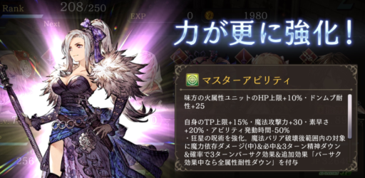 ![]() 味方の火属性ユニットのHP上限+10%・ドンムブ耐性+25 自身のTP上限+15%、魔法攻撃力+30、素早さ+10%、アビリティ発動時間-50% ⇩MA強化⇩ 味方の火属性ユニットのHP上限+10%・ドンムブ耐性+25 自身のTP上限+15%、魔法攻撃力+30、素早さ+20%、アビリティ発動時間-50% | ||