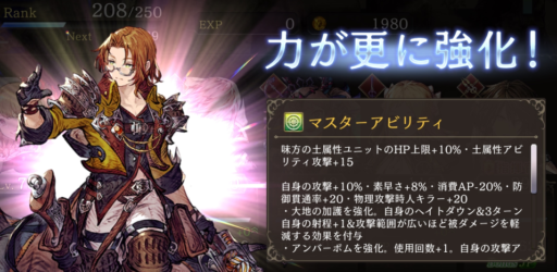 ![]() 味方の土属性ユニットのHP上限+10%・土属性アビリティ攻撃+15 自身の攻撃+10%、消費AP-20%、防御貫通率+20、物理攻撃時人キラー+20 ⇩MA強化⇩ 味方の土属性ユニットのHP上限+10%・土属性アビリティ攻撃+15 自身の攻撃+10%、素早さ+8%、消費AP-20%、防御貫通率+20、物理攻撃時人キラー+20 | ||