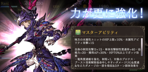![]() 味方の水属性ユニットのHP上限+10%・水属性アビリティ攻撃+15 自身の刺突攻撃+15・単体攻撃耐性貫通率+15・治癒力+10・HP70%以上でガッツ効果 ⇩MA強化⇩ 味方の水属性ユニットのHP上限+10%・水属性アビリティ攻撃+15 自身の刺突攻撃+15・単体貫通+15・治癒力+10・獲得AP+30%・HP70%以上でガッツ効果 | ||