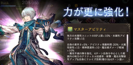 ![]() 味方の水属性ユニットのHP上限+10%・水属性アビリティ攻撃+15 自身の詠唱時間短縮200・火属性耐性+15 ⇩MA強化⇩ 味方の水属性ユニットのHP上限+10%・水属性アビリティ攻撃+15 自身の素早さ+5%・詠唱時間短縮200・火属性耐性+15・精神貫通+10・魔法被ダメ軽減10% | ||