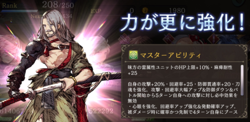 | 「刀舞・鬼道」 ブースト(物理被ダメ軽減貫通+40、リアクション阻止率+50) 攻撃命中時3Tガッツ解除封印 HP40%以上の被ダメ時にHP割合回復(中)(2回)追加 |