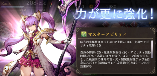 ![]() 味方の光属性ユニットのHP上限+10%・光属性アビリティ攻撃+15 自身の防御+25、魔法攻撃耐性+20、アビリティ発動時間-30% ⇩MA強化⇩ 変化なし | ||