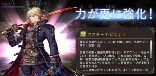 | ①「王家の血筋」(サポアビ) 行動開始時、MAP内の味方のAP+10、1ターン物理ダメ上昇10% ②「ここは俺に任せてくれ」 効果4ターンに・自身にガッツ 攻撃前3ターン対象のエレチェ・タイプチェ耐性25ダウン追加 | ||