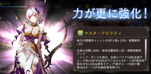 ![]() 味方の闇属性ユニットのHP上限+10%・暗闇耐性+25 自身の攻撃+30%、単体耐性+25 ⇩MA強化⇩ 味方の闇属性ユニットのHP上限+10%・暗闇耐性+25 自身の攻撃+30%、単体耐性+25、暗闇係数+0.15 | ||
