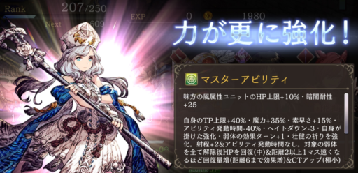 ![]() 味方の風属性ユニットのHP上限+10%・暗闇耐性+25 自身のTP上限+40%、魔力+35%、アビリティ発動時間-40%、ヘイトダウン-3、自身がかけた強化・弱体の効果+1ターン ⇩MA強化⇩ 変化なし | ||