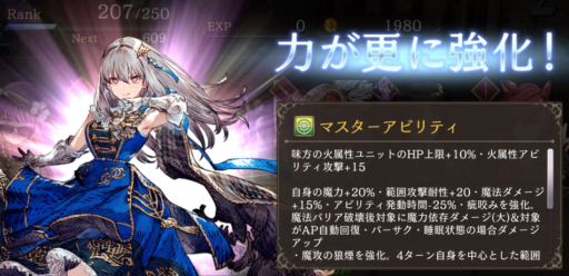 ![]() 味方の火属性ユニットのHP上限+10%・火属性アビリティ攻撃+15 自身のアビリティ発動時間短縮 -20%、範囲攻撃耐性+20、魔力+20%、疵裂きを強化(魔法バリアを破壊追加) ⇩MA強化⇩ 味方の火属性ユニットのHP上限+10%・火属性アビリティ攻撃+15 自身のアビリティ発動時間短縮 -25%、範囲攻撃耐性+20、魔力+20%、魔法ダメージ+15%、疵裂きを強化(魔法バリアを破壊追加) | ||