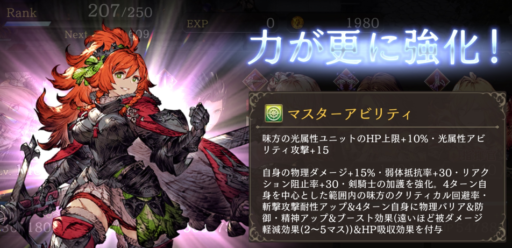 | 「剣騎士の加護」 自身に物理50%バリア、ブースト(遠い程被ダメ軽減8(2~5マス))追加 |
