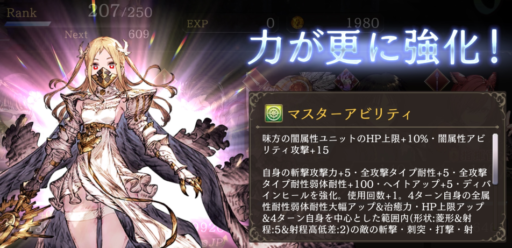 ![]() 味方の光属性ユニットのHP上限+10%・光属性アビリティ攻撃+15 自身の弱体抵抗率+15、範囲貫通+20 ⇩MA強化⇩ 味方の光属性ユニットのHP上限+10%・光属性アビリティ攻撃+15 自身の弱体抵抗率+15、範囲貫通+20、魔法被ダメ軽減貫通20% 遠い程物魔被ダメ軽減5~20(4~7マス) | ||
