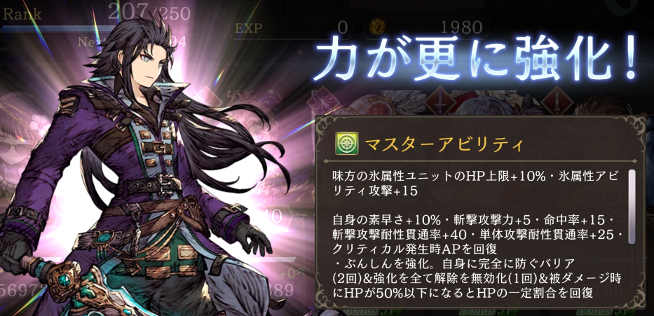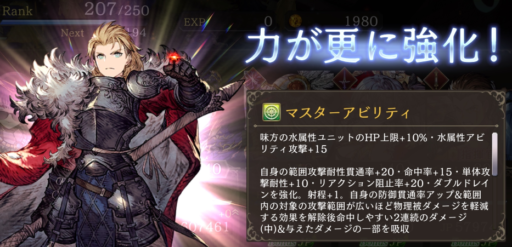 ![]() 味方の水属性ユニットのHP上限+10%・水属性アビリティ攻撃+15 自身の単体耐性10、リアクション阻止率+20、範囲耐性貫通+20、命中+15 ⇩MA強化⇩ 味方の水属性ユニットのHP上限+10%・水属性アビリティ攻撃+15 自身の単体耐性10、リアクション阻止率+20、範囲耐性貫通+20、命中+15 | ||