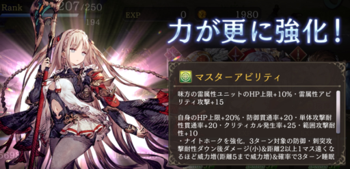 ![]() 味方の雷属性ユニットのHP上限+10%・雷属性アビリティ攻撃+15 自身の防御貫通率+20、HP上限+20%、範囲攻撃耐性+10 ⇩MA強化⇩ 味方の雷属性ユニットのHP上限+10%・雷属性アビリティ攻撃+15 自身の防御貫通率+20、HP上限+20%、単体貫通+20、クリティカル発生+25、範囲攻撃耐性+10 | ||