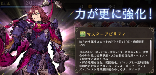 ![]() 味方の土属性ユニットのHP上限+10%・麻痺耐性+25 自身のHP上限+25%、防御+10、命中+40、攻撃命中時対象のAP自動回復及びヘイストを解除する効果を付与 ⇩MA強化⇩ 味方の土属性ユニットのHP上限+10%・麻痺耐性+25 自身のHP上限+25%、防御+10、命中+40、攻撃命中時対象の追撃・AP自動回復及びヘイストを解除する効果を付与 | ||