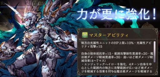 ![]() 味方の光属性ユニットのHP上限+10%・光属性アビリティ攻撃+15 自身の弱体抵抗率+15・リアクション阻止率+30 ⇩MA強化⇩ 味方の光属性ユニットのHP上限+10%・光属性アビリティ攻撃+15 自身の物理ダメージ+15%・弱体抵抗率+30・リアクション阻止率+30 | ||